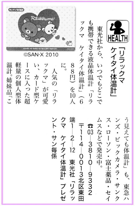 サンデー毎日「8.15増大号」で読者プレゼントとして、「リラックマ ケイタイ体温計」が取り上げられました。
